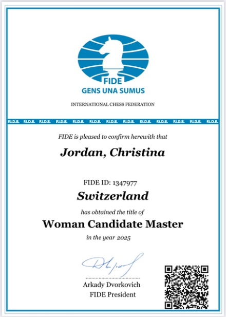 Dank Ihrer ELO-Zahl von 2000 hat der Weltschachbund FIDE Christina im Alter von 13 Jahren den WCM (Meisterkandidatin) - Titel vergeben. Herzlichen